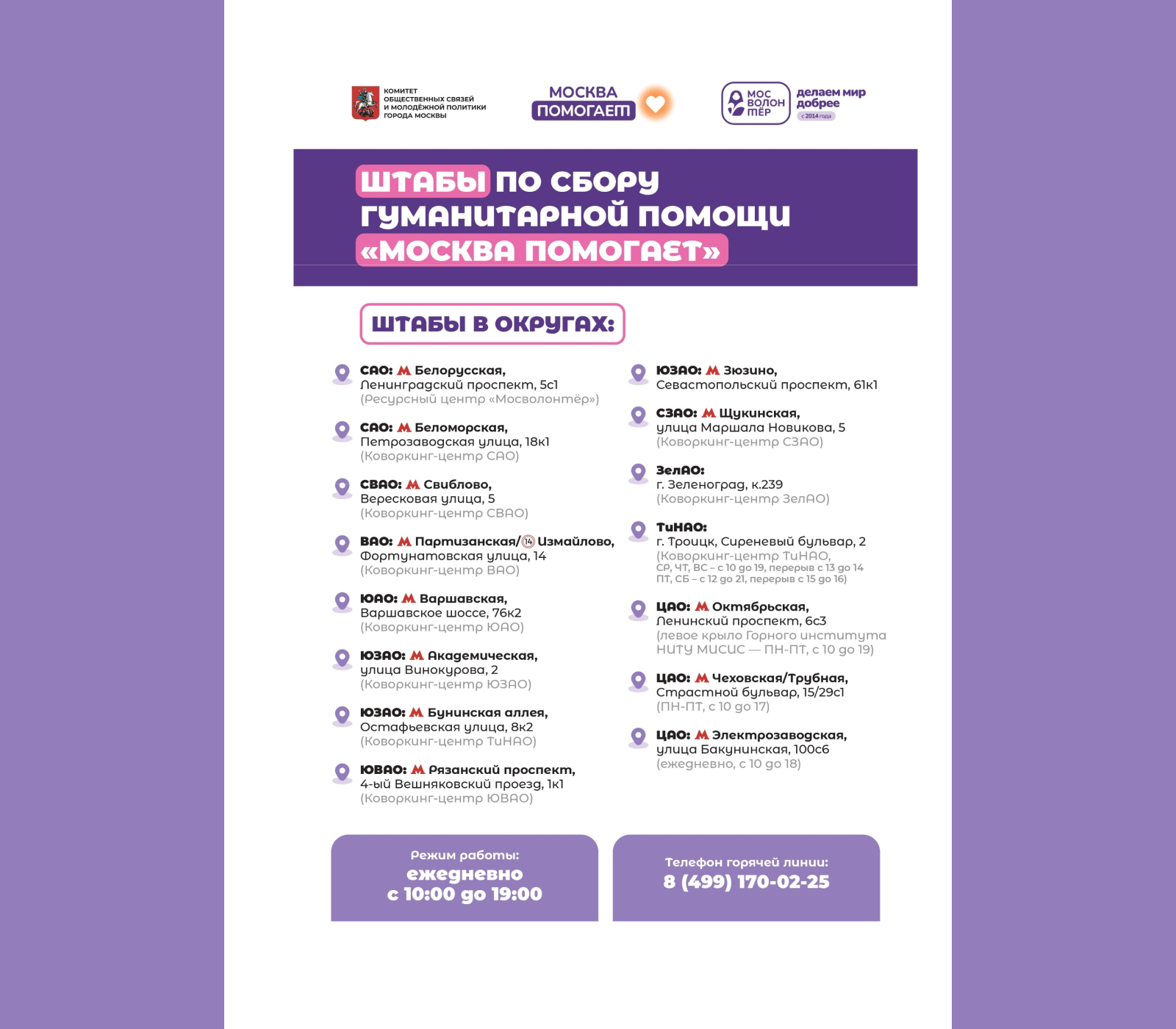 Узнать о том, что можно принести и в чем есть особая необходимость, а также где находится ближайший Штаб, можно ежедневно: с 10:00 до 19:00